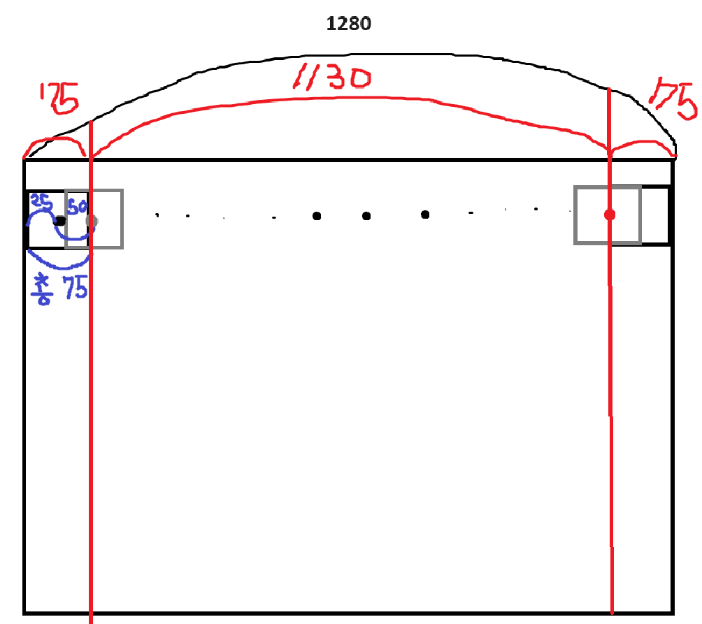 1280 - ( 50 + 25 * 2 ) * 2 이므로 1130 입니다.