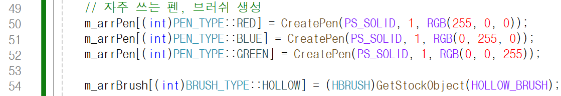 CreatePen 함수를 통해 자주 쓰게 될 펜과 브러쉬들을 생성해 줍니다.