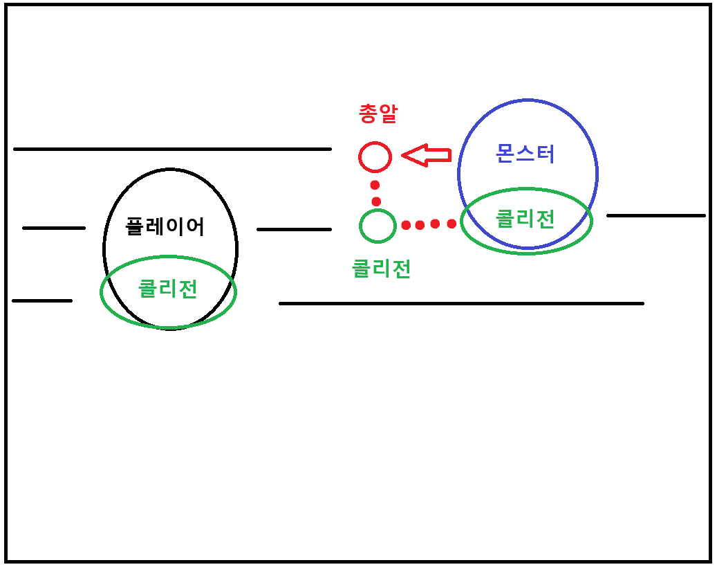 이 경우 더 뒤쪽에 있는 오른쪽 몬스터가 총알을 발사하면,