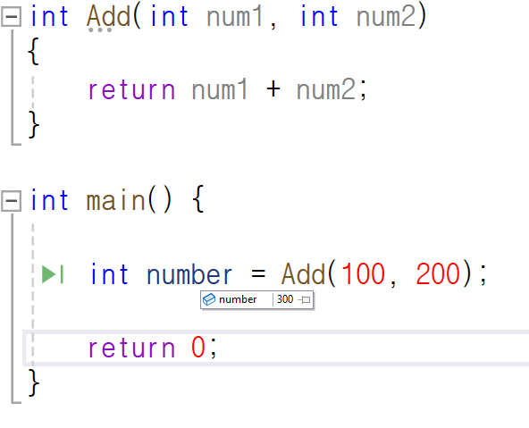Add 함수는 100과 200을 받아 더해 300을 int형으로 반환합니다.