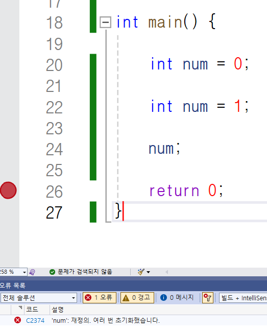 같은 이름의 변수를 두 개 선언했더니 오류가 발생합니다.