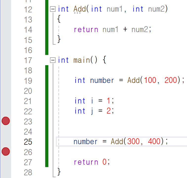 23번 째 줄과 26번 째 줄에 중단점을 찍겠습니다.