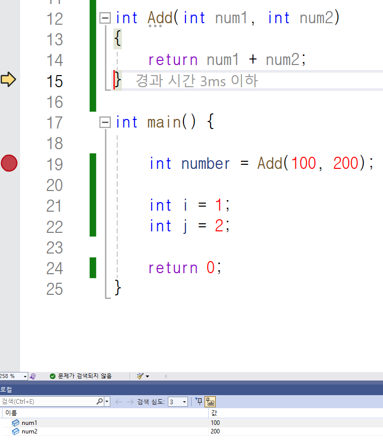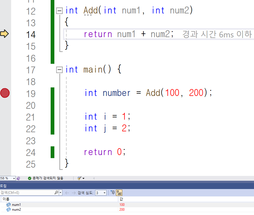 이번애는 F11을 눌러 한 단계씩 코드를 실행해 보죠.