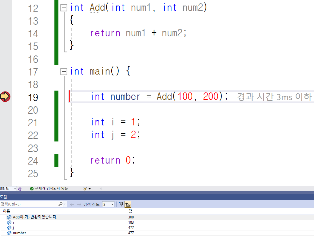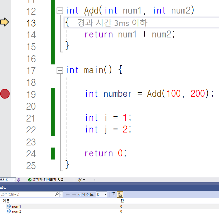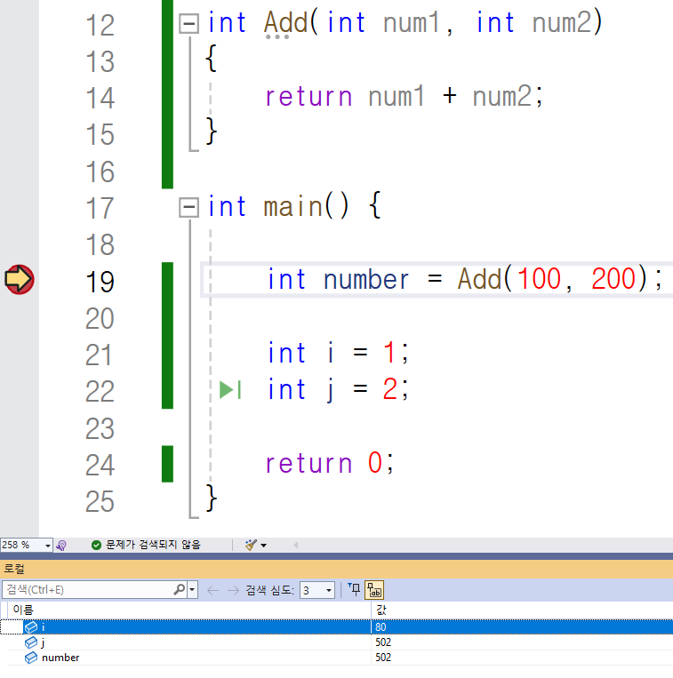 이번에는 19번 째 줄에 중단점을 걸고 디버깅하겠습니다.
