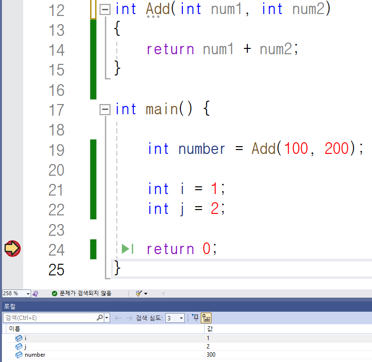 24번 째 줄에 중단점을 찍고 디버깅을 한 모습입니다.