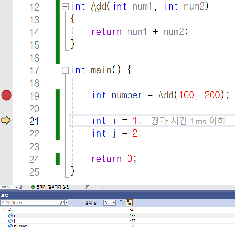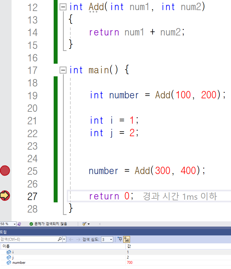 중단점을 두 개 찍고 디버깅을 해 봅시다.
