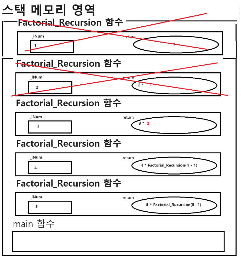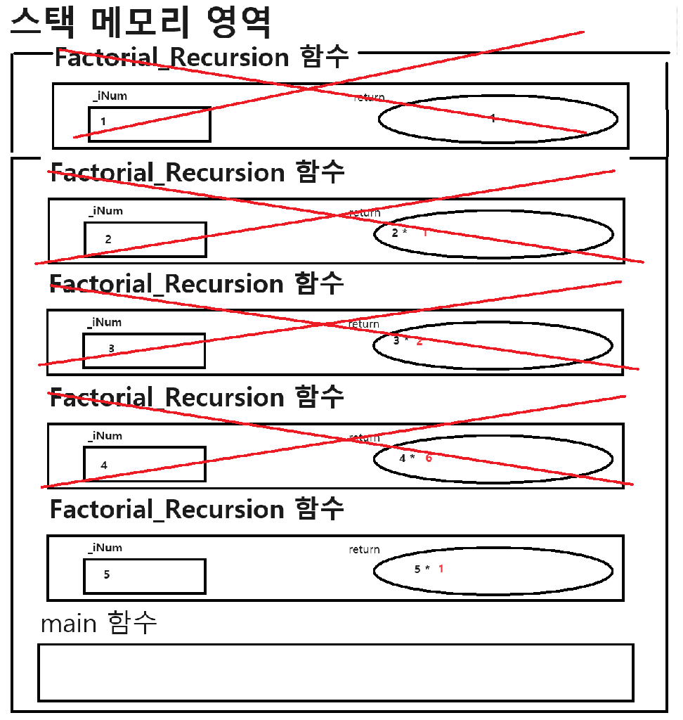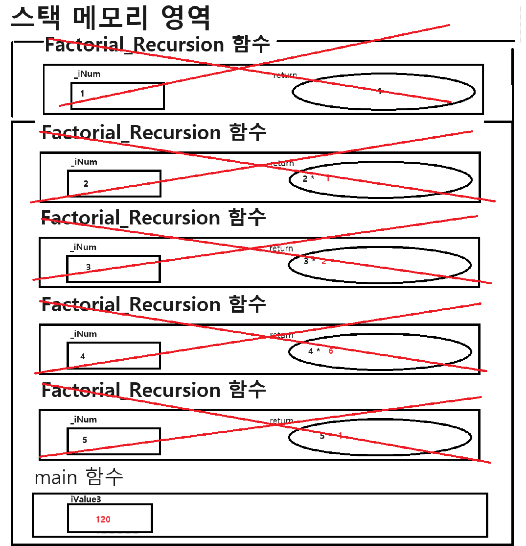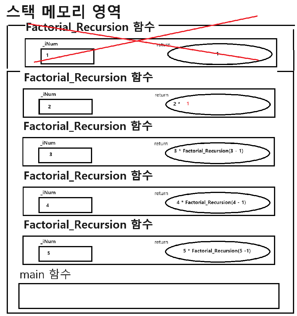 Factorial_Recursion 함수의 지역변수 _iNum에는 5가 들어갑니다.