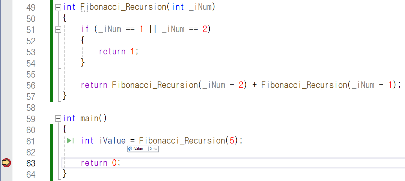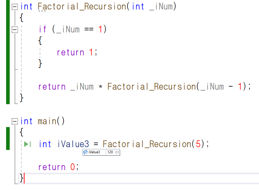 main 함수 코드, int iValue3 = Factorial_Recursion(5)에서