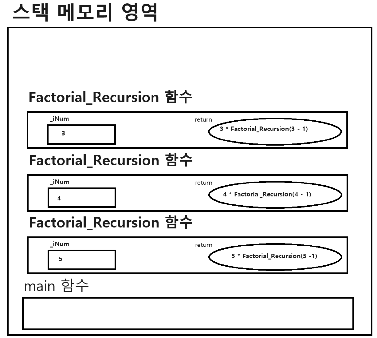 세 번째 Factorial_Recursion 함수의 지역변수 _iNum에는 3이 들어갑니다.