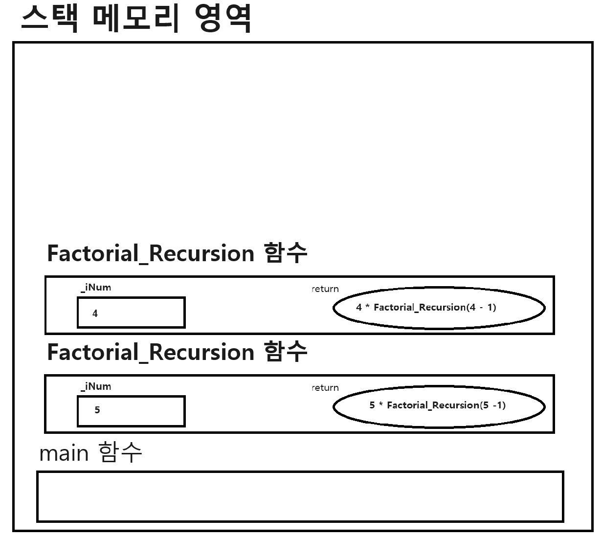 두 번째 Factorial_Recursion 함수의 지역변수 _iNum에는 4가 들어갑니다.