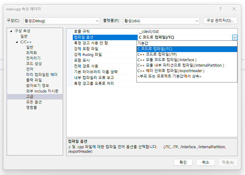"C 코드로 컴파일(/TC)"를 클릭합니다.