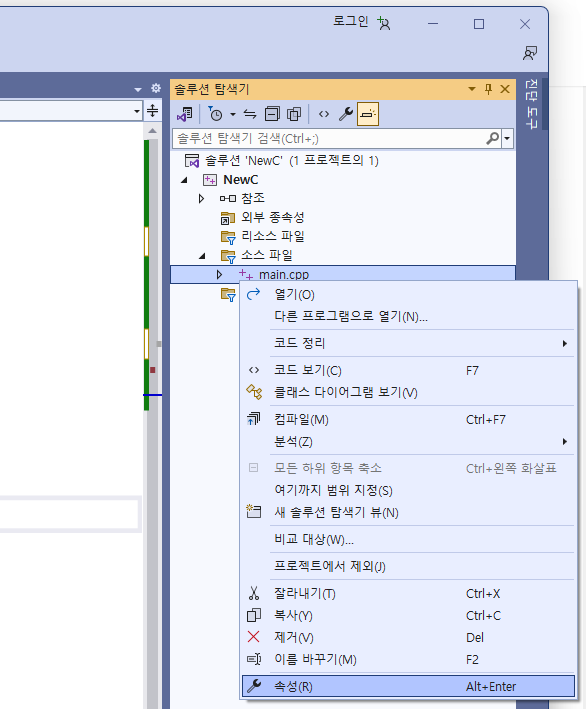 현재 작성 중인 파일을 우클릭하고 (저는 'main.cpp'라는 이름의 파일입니다.)