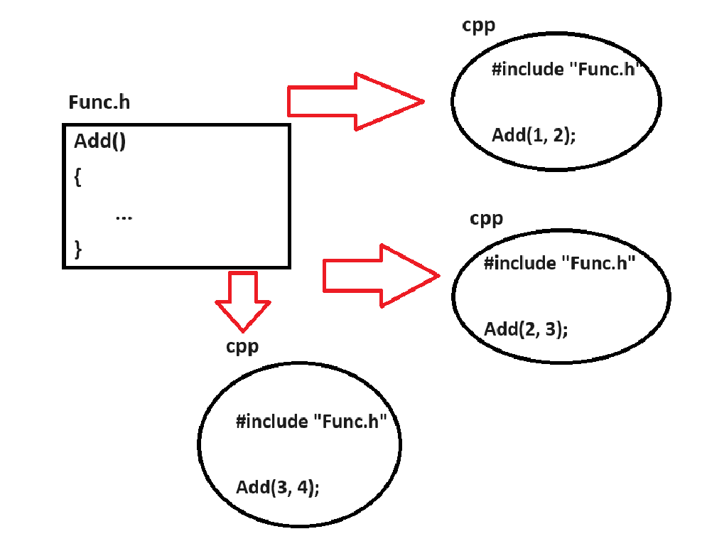 즉 각 파일마다 Func.h의 내용을 복사해서 붙여넣는 것이죠.