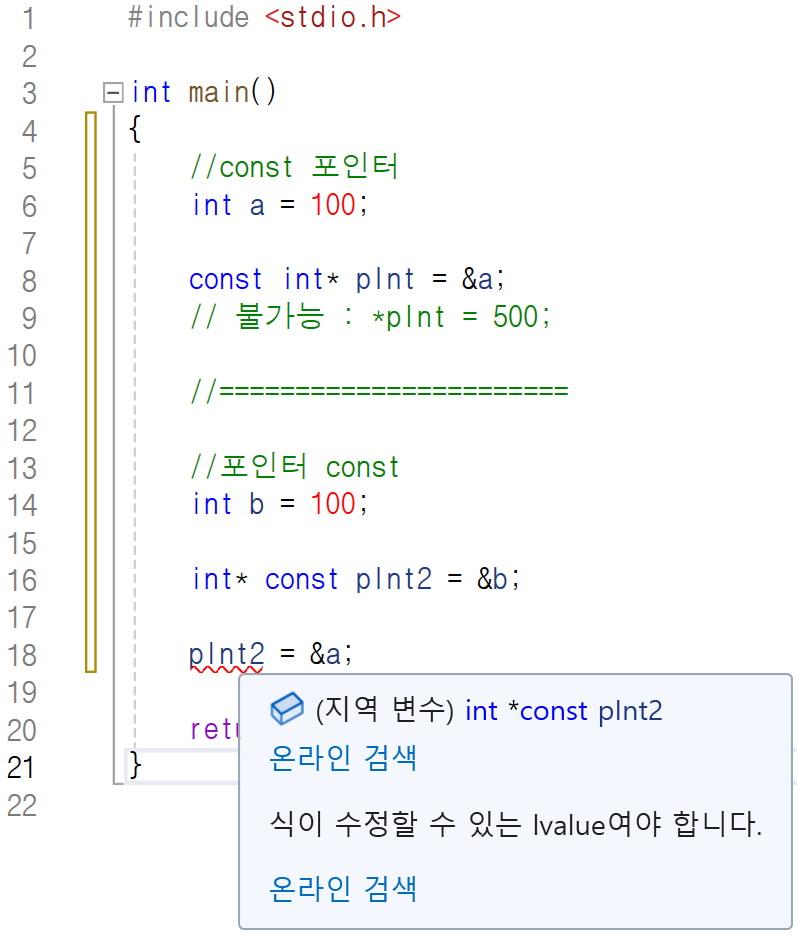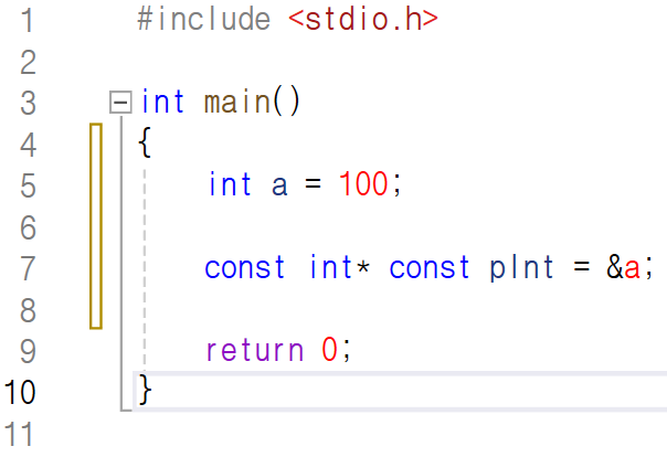 즉 변수 a의 값을 수정할 수도, pInt에 다른 주솟값을 넣을 수도 없는 것이죠.