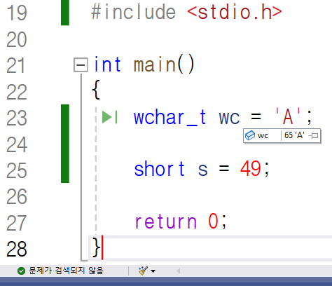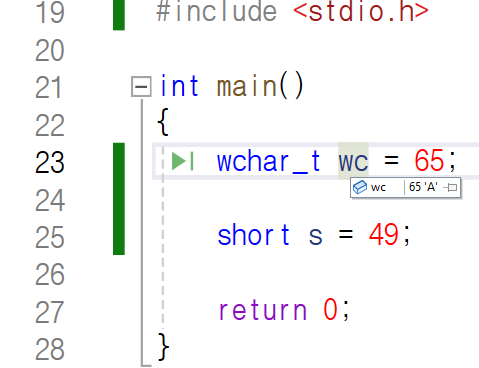 대문자 A를 넣으니 변수 wc에는 65가 담겨 있음을 확인할 수 있습니다.