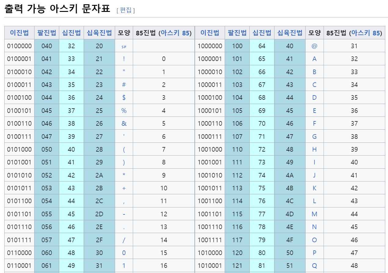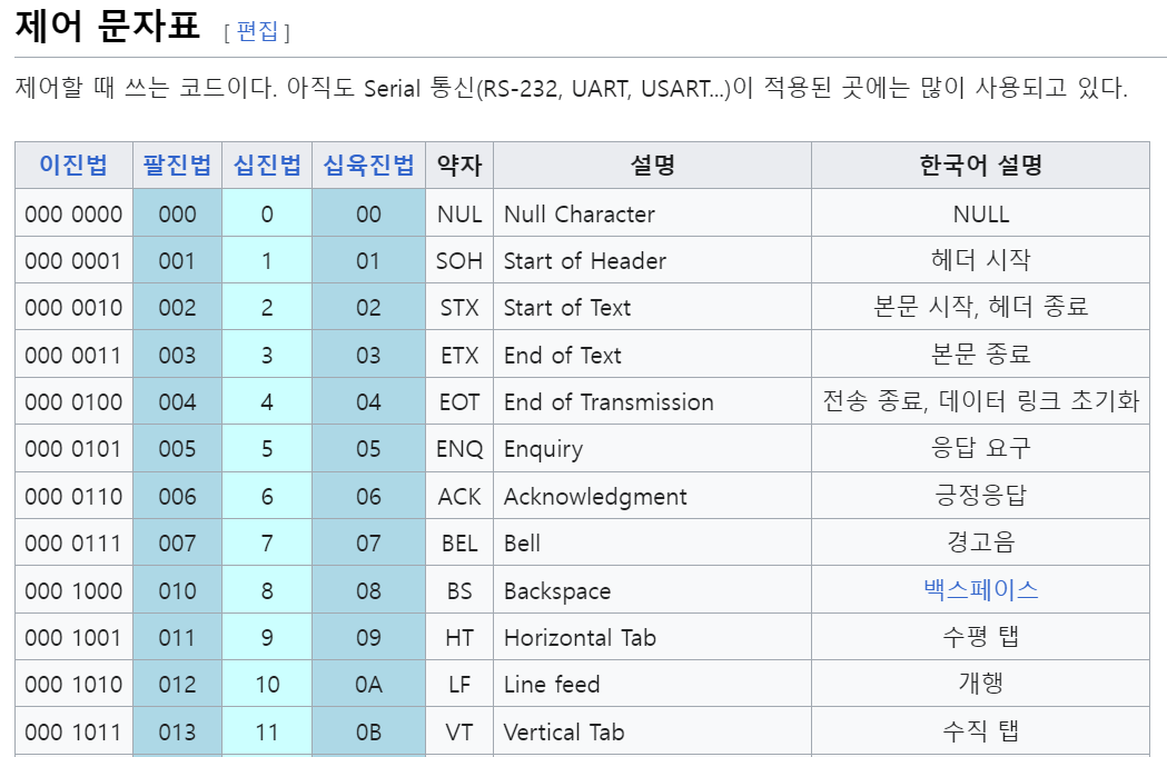 출처 : https://ko.wikipedia.org/wiki/ASCII