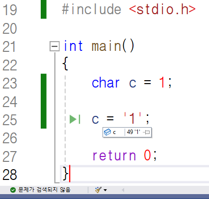 이번에는 char형 변수 c에 정수 1이 아닌 문자 1을 넣었습니다.