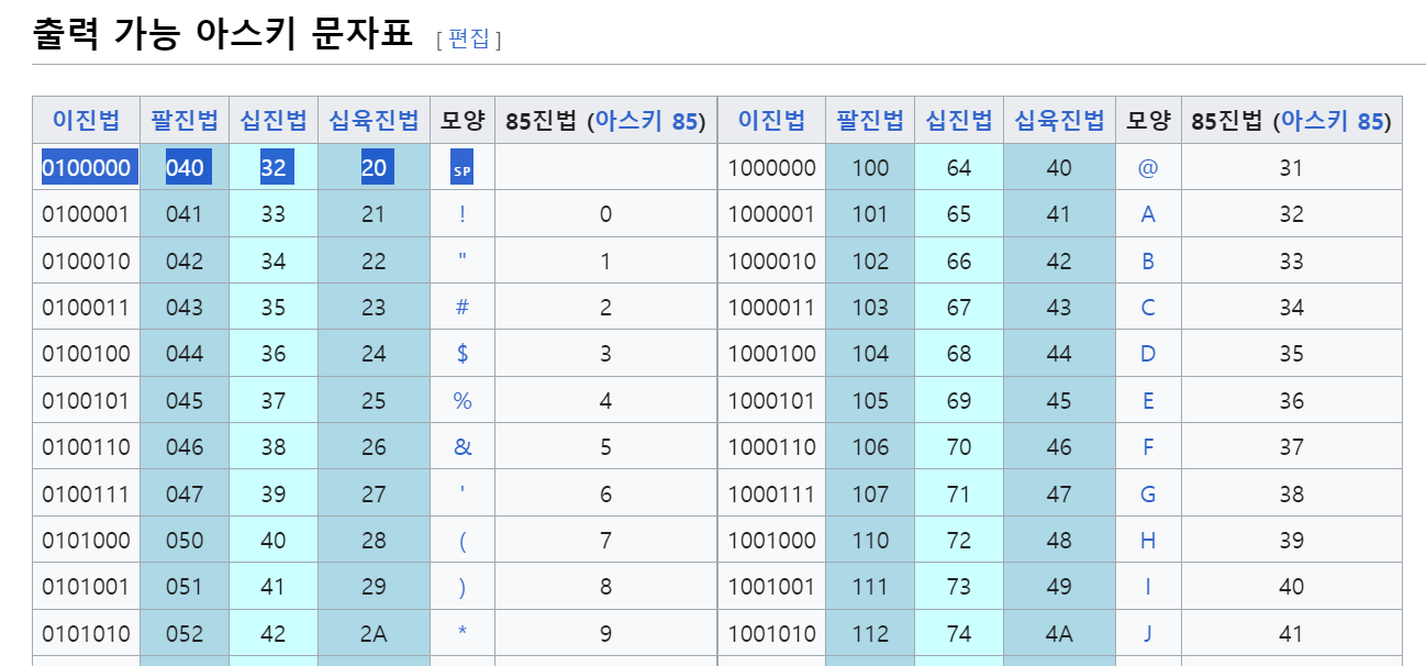 공백(SPACE, 띄어쓰기)은 32라는 값으로 표현합니다.