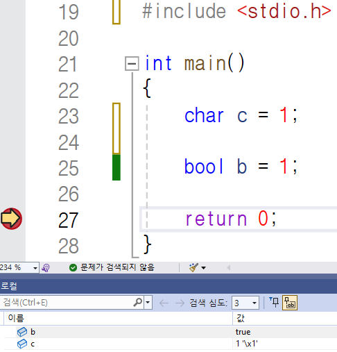 bool형 변수 b를 선언한 후 1을 대입했습니다.