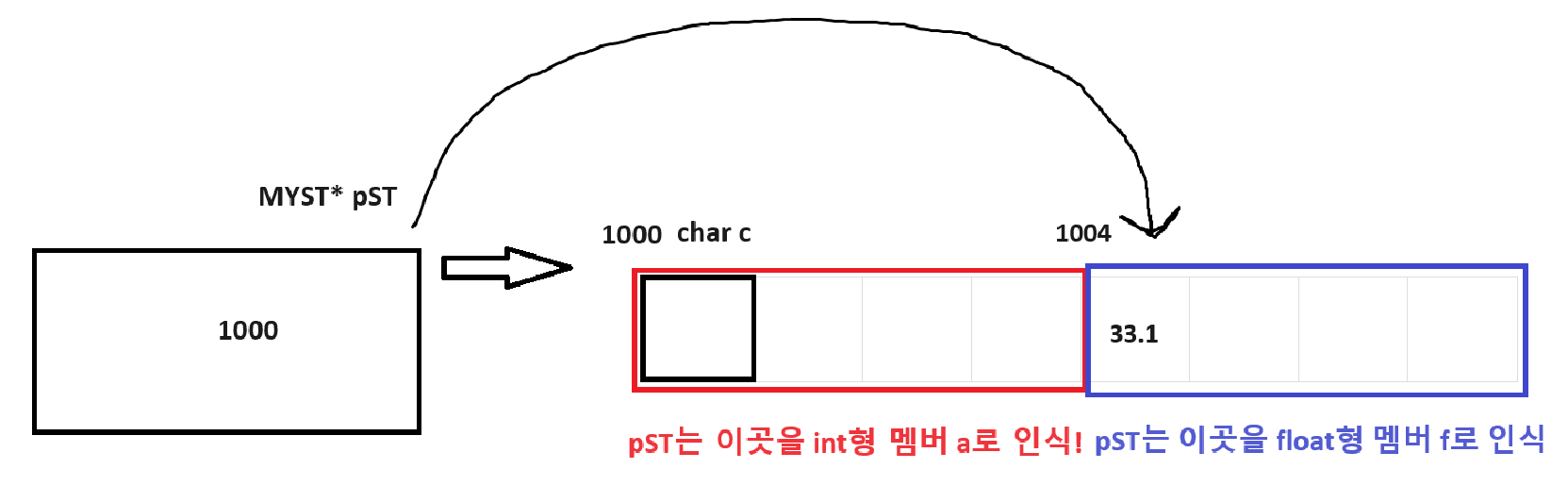 이유는 MYST라는 구조체(자료형)은 두 개의 4Byte 멤버(int와 float)를