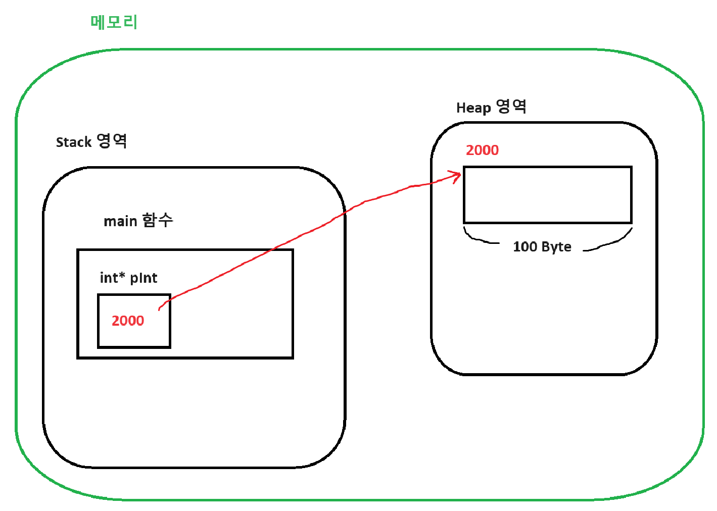 int형 포인터 변수 pInt에 100Byte 공간의 시작 주소가 저장되었겠네요.