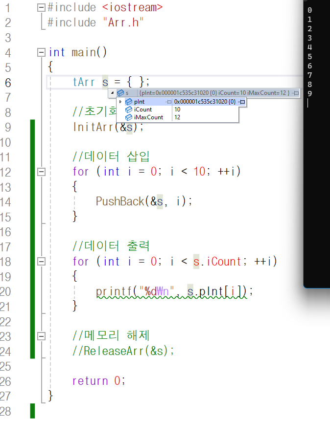 동적 할당된 공간에 있는 값을 출력해 보니 0 ~ 9가 출력되었습니다.