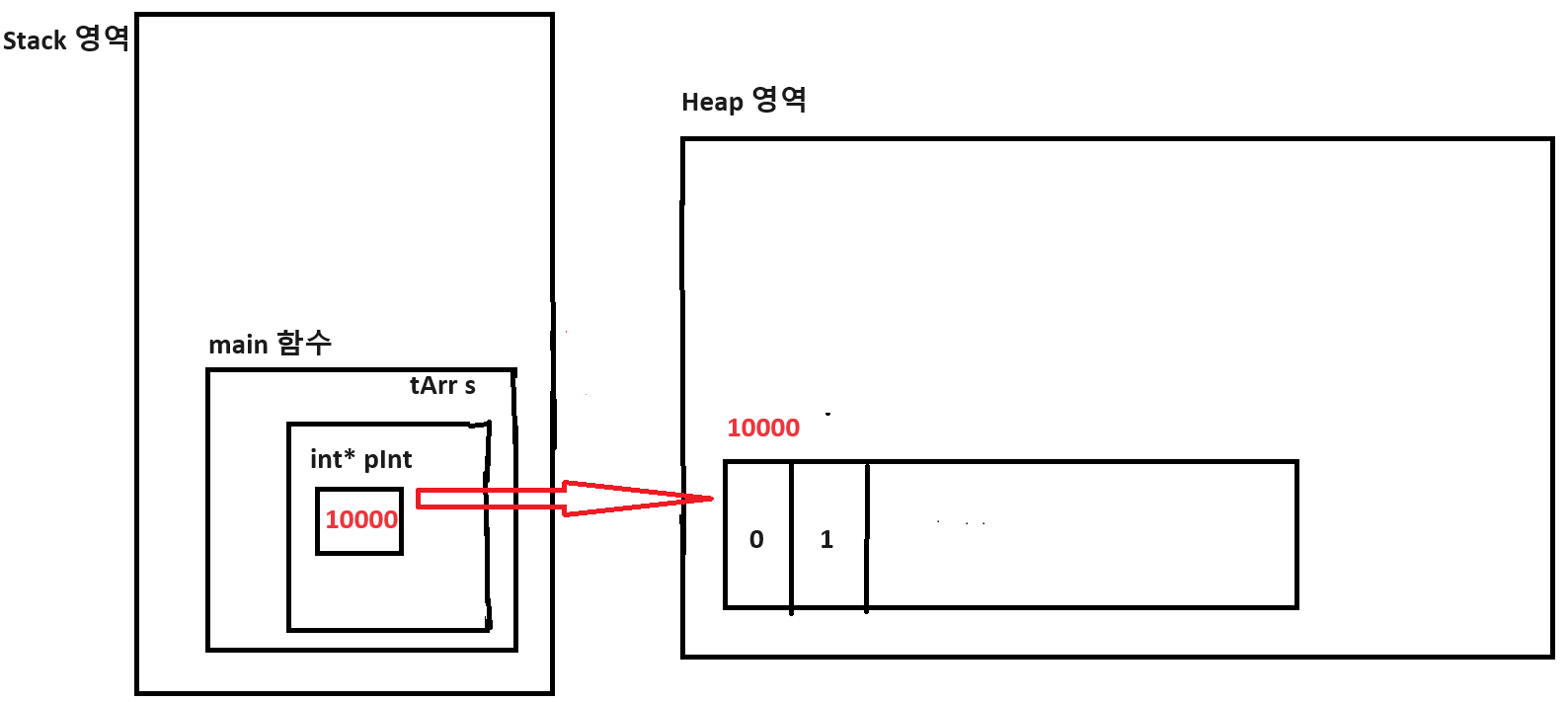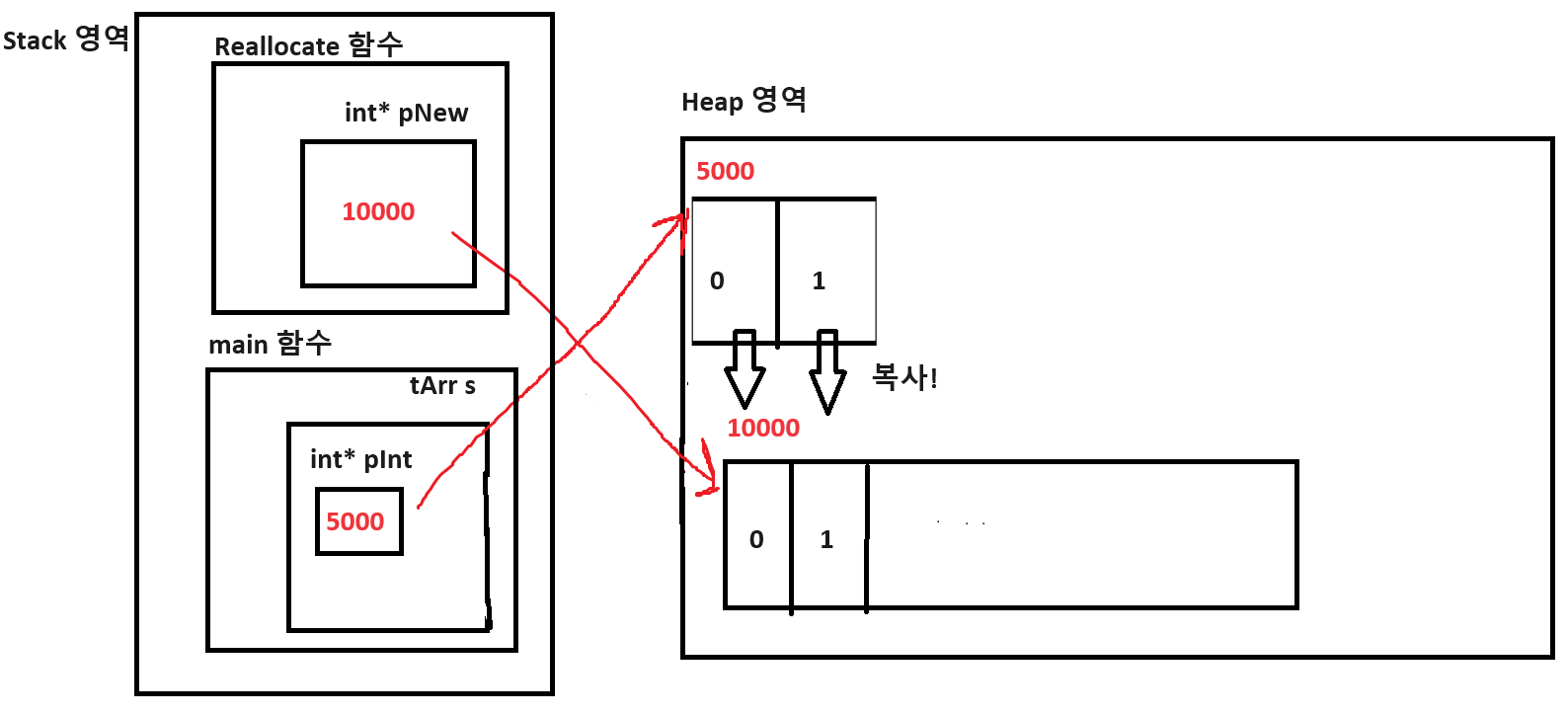 이후 pInt가 새로운 동적 할당 공간을 가리키도록 pNew가 저장하고 있는 주솟값을 넘겨 줍니다.