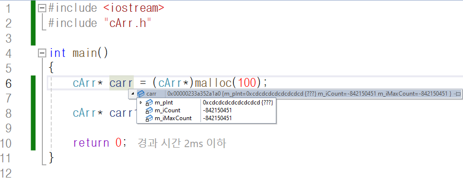 6번째 줄에서 carr은 100Byte의 공간을 가리키고 있습니다.