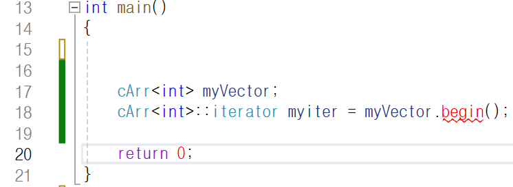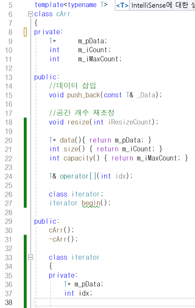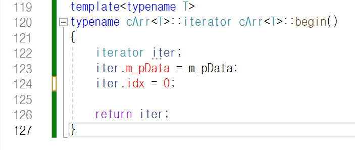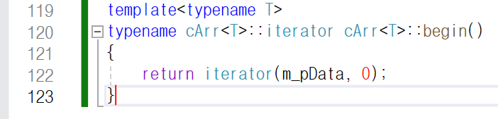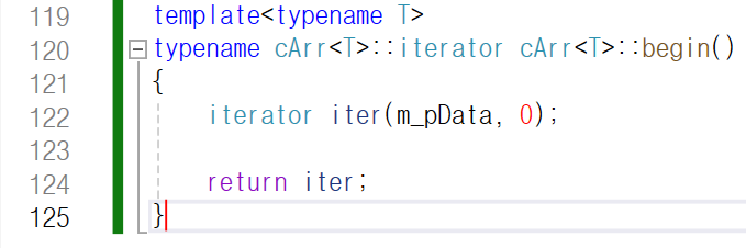 그리고 cArr<T> 클래스의 멤버 함수 begin를 정의한다는 의미입니다.