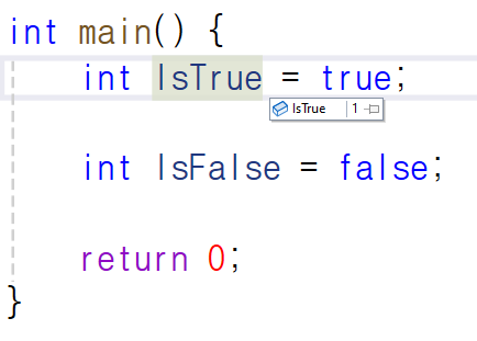 위 사진에서 true라는 값을 넣은 변수 IsTrue의 값을 확인해 보면 1이 들어갔습니다.