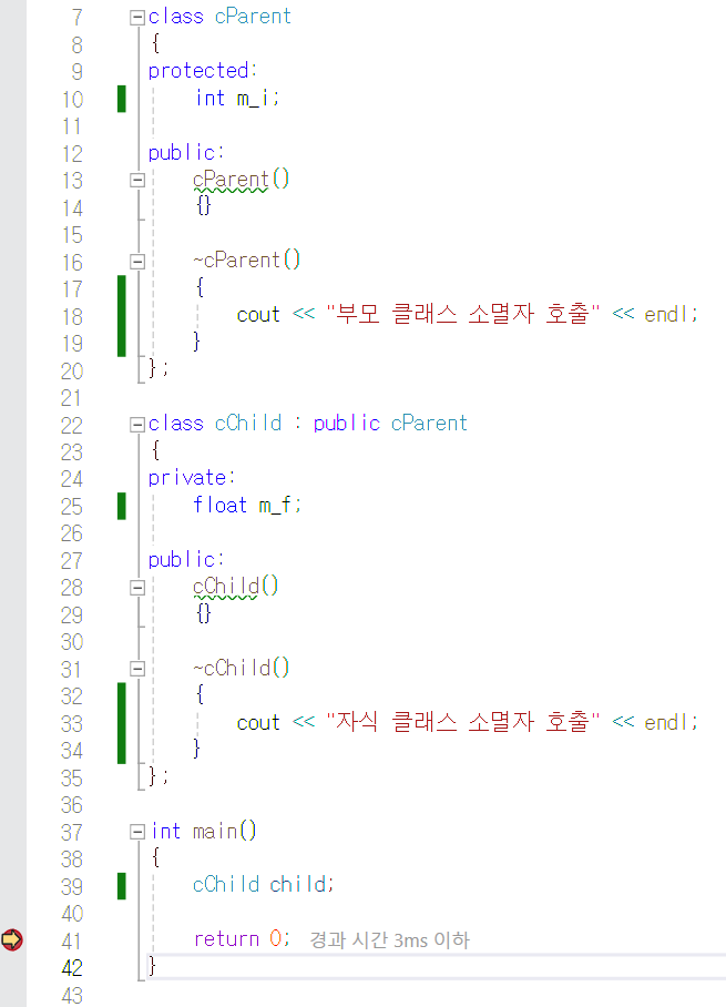 그러면 main 함수 종료 직전에 자식 클래스에 있는 소멸자와