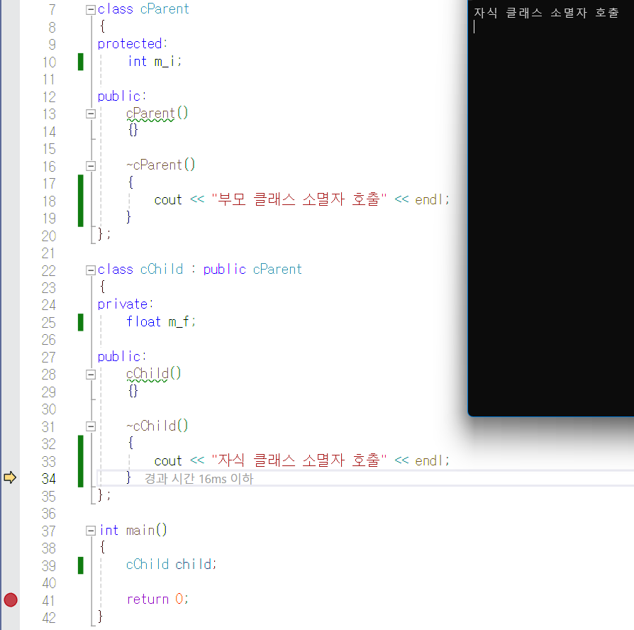F11을 누르자 자식 클래스의 소멸자가 먼저