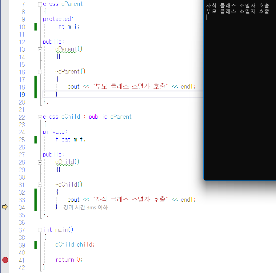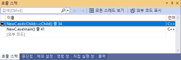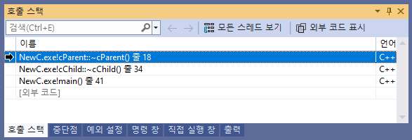 부모 클래스 소멸자의 동작이 완료되어 스택에서 사라졌습니다.