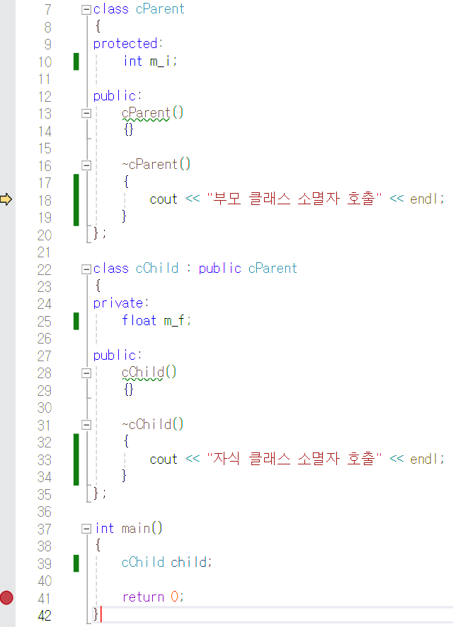 F10을 눌러 쭉 실행하고 자식 클래스의 소멸자가