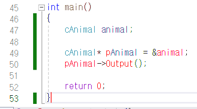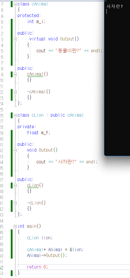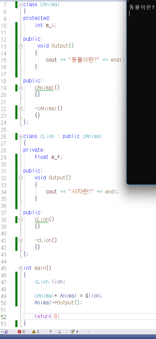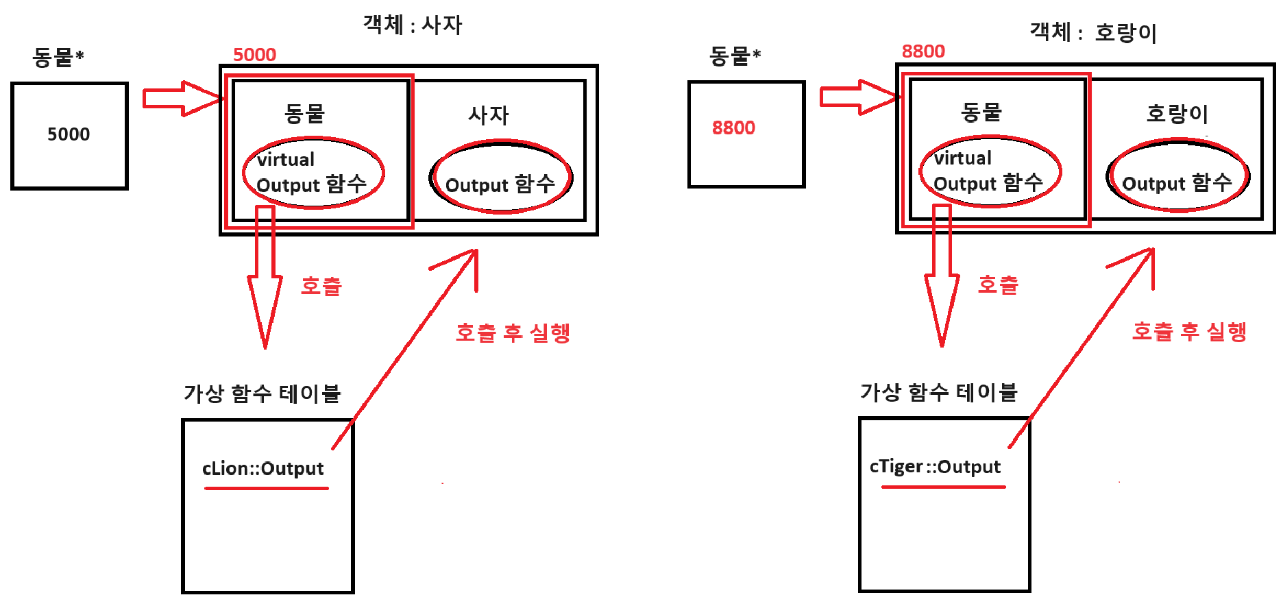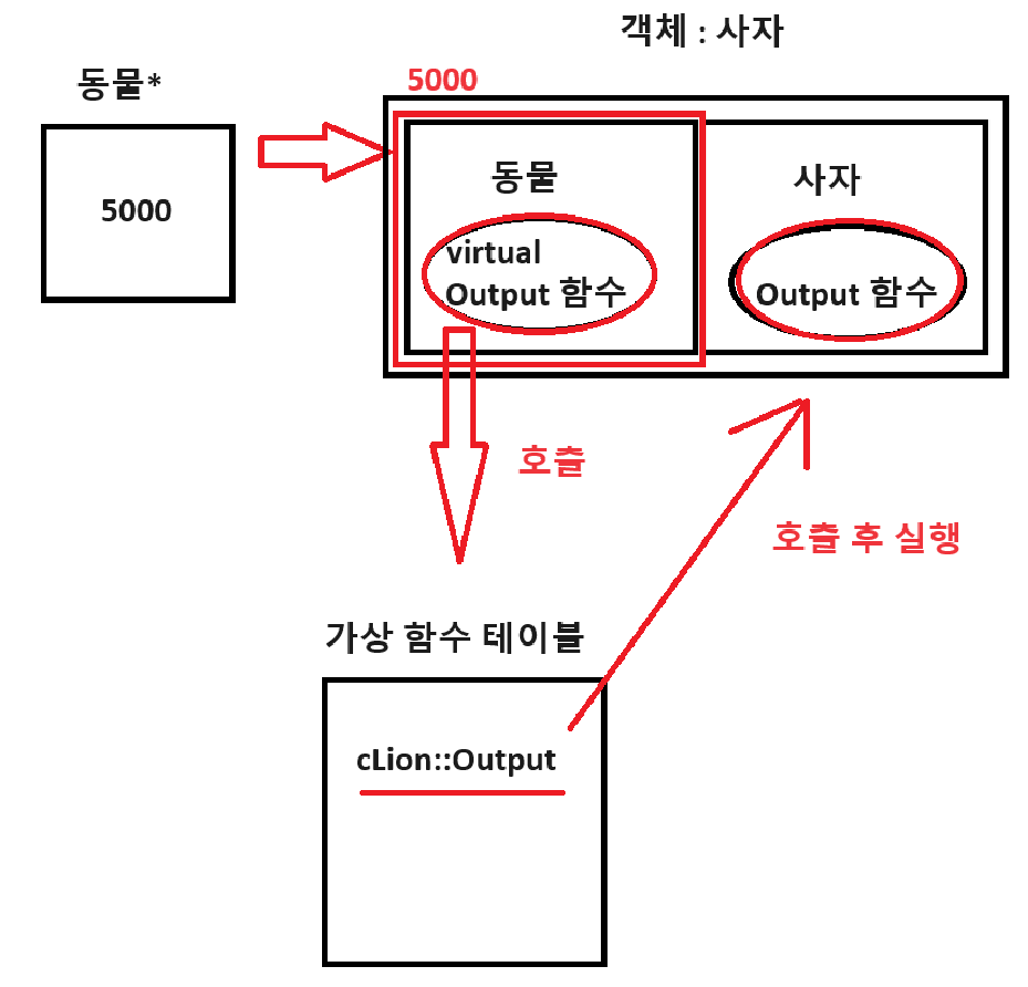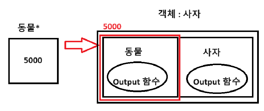 동물 포인터로 사자 객체의 Output 함수를 호출하면
