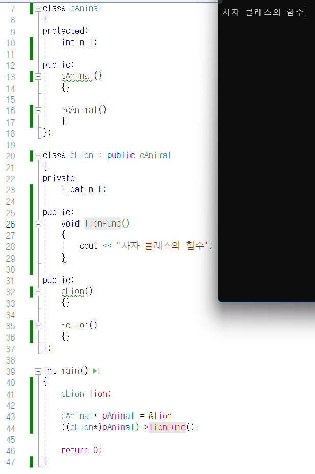 그래서 사자 포인터로 형 변환하여 사자 클래스 멤버 함수를