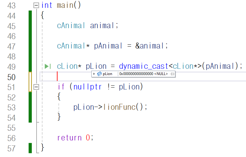 동물 포인터를 사자 포인터로 강제 형 변환하면