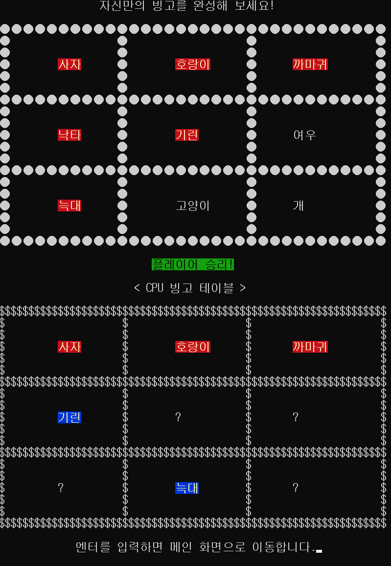 게임이 종료된 후에는 엔터를 누르면 다시 메인 메뉴 화면으로