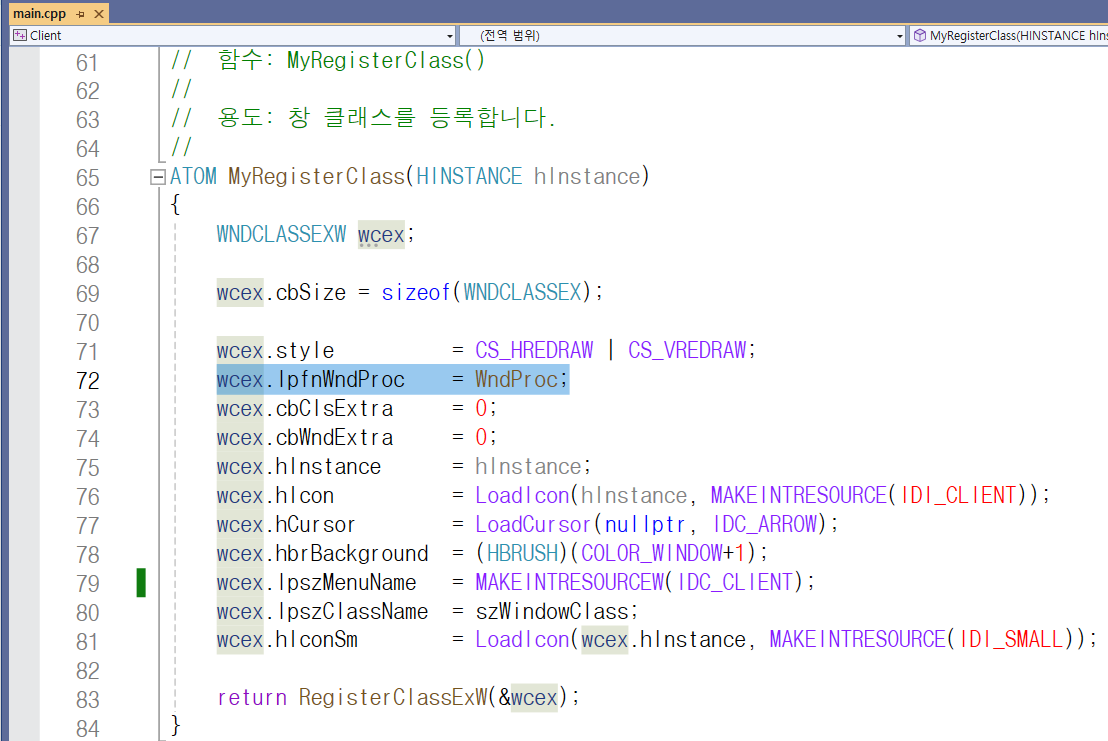 72번째 줄에서 wcex의 멤버 IpfnWndProc에 WndProc를