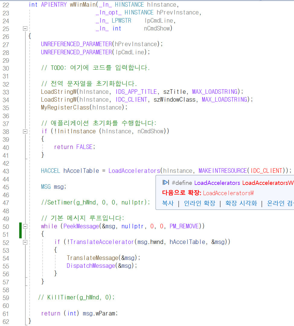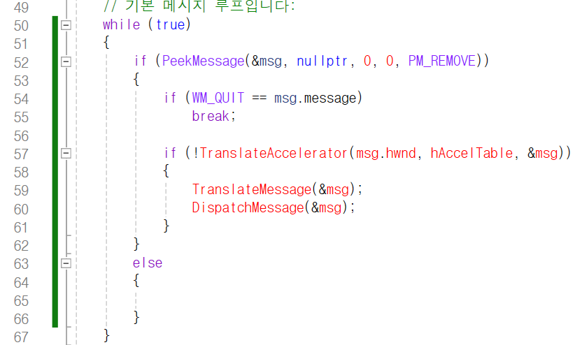 근데 PeekMessage 함수를 while 문의