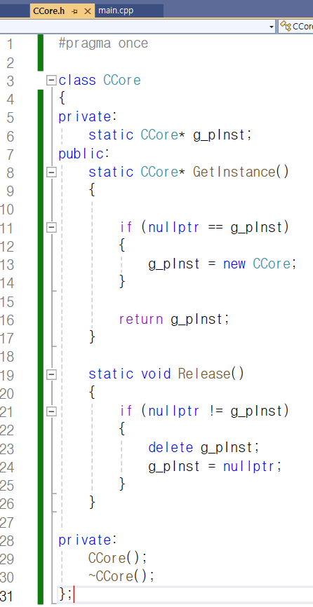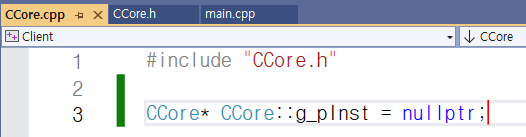 그래서 정적 멤버로 g_pInst를 추가하였고 CCore.cpp 파일에서