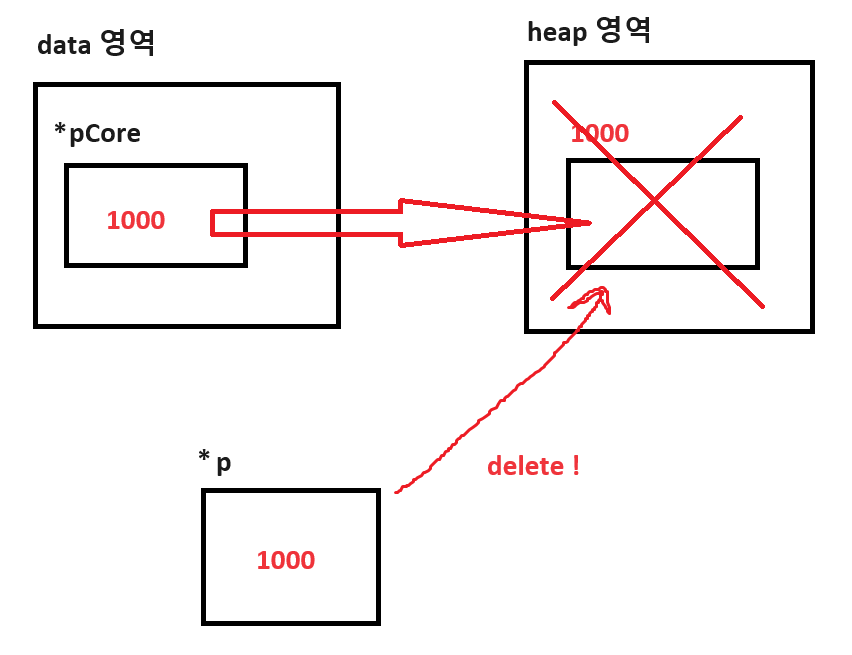 포인터 pCore가 가리키는 공간은 비록 메모리 해제되었지만