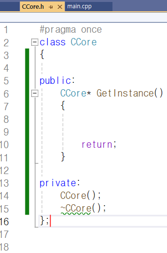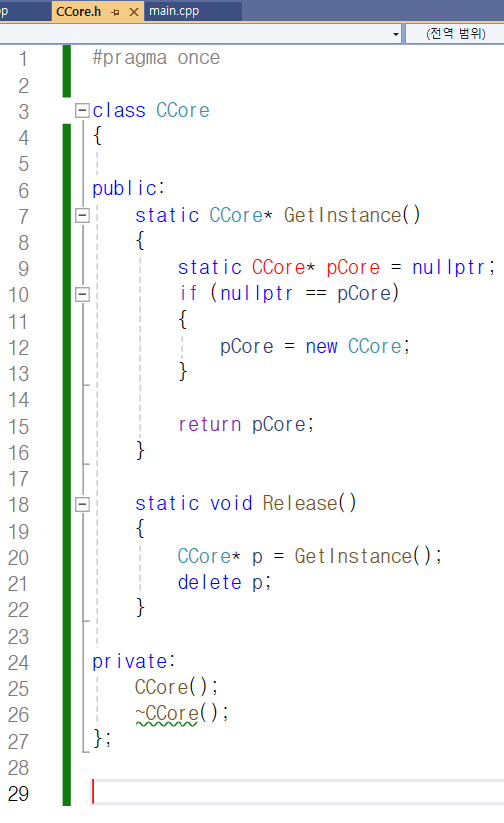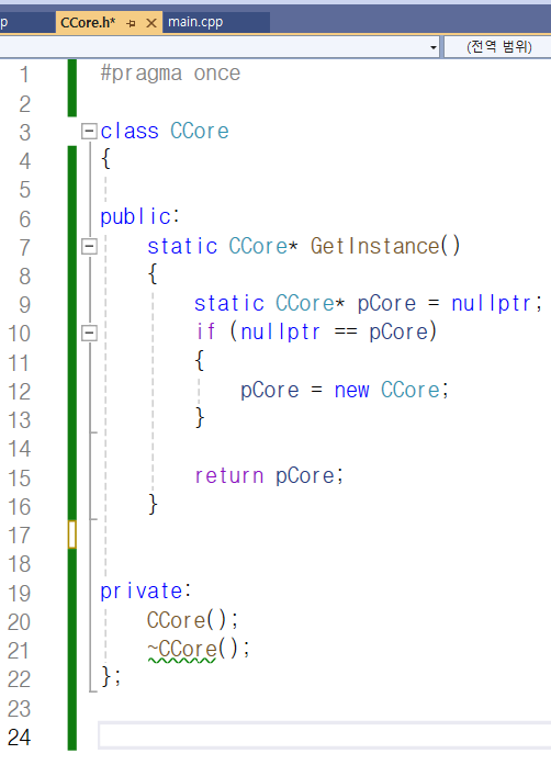 그래서 정적 멤버로 g_pInst를 추가하였고 CCore.cpp 파일에서