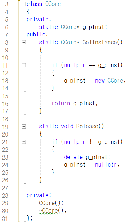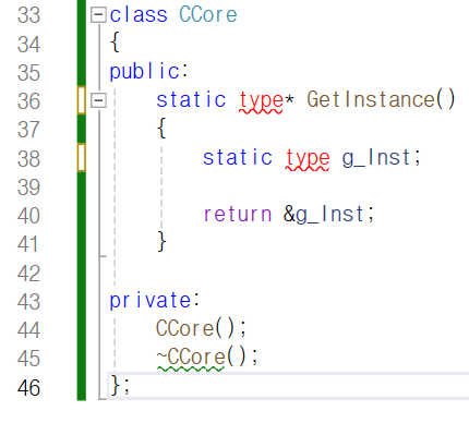 CCore 객체를 하나 만들기 위한 GetInstance 함수 안에