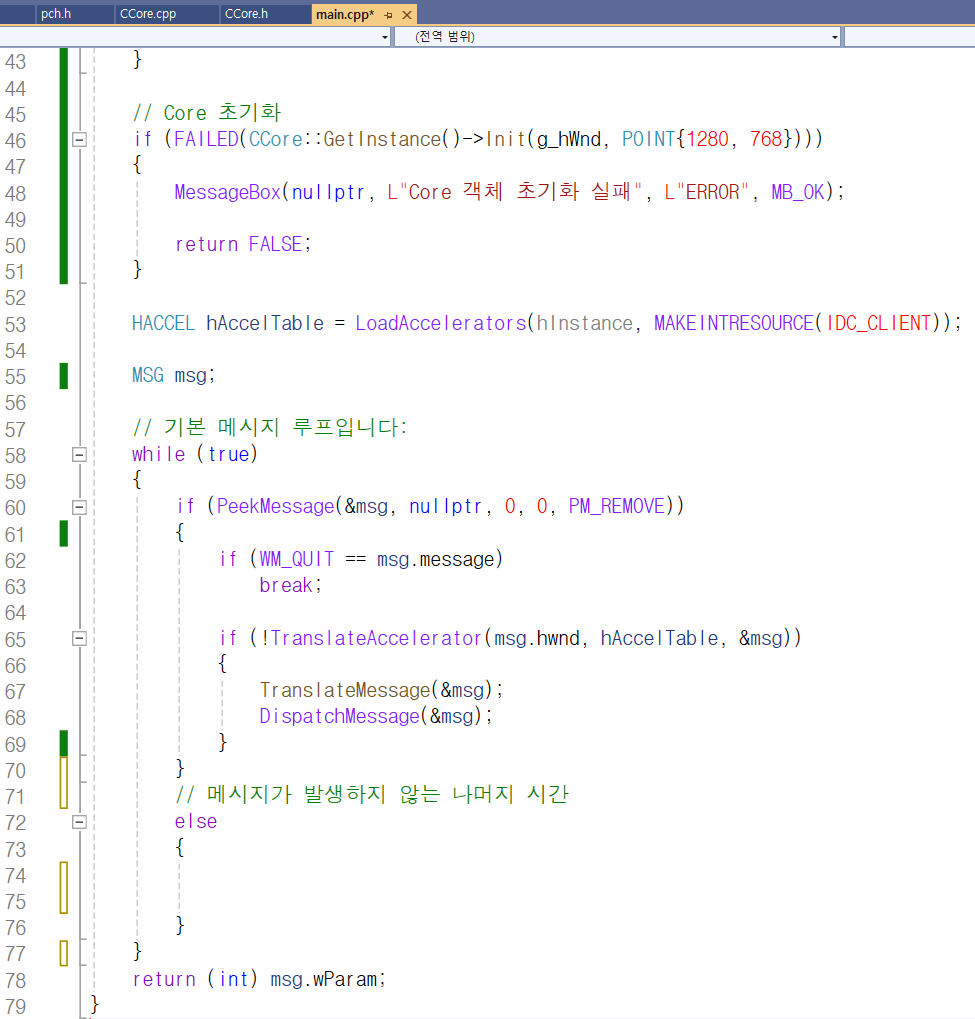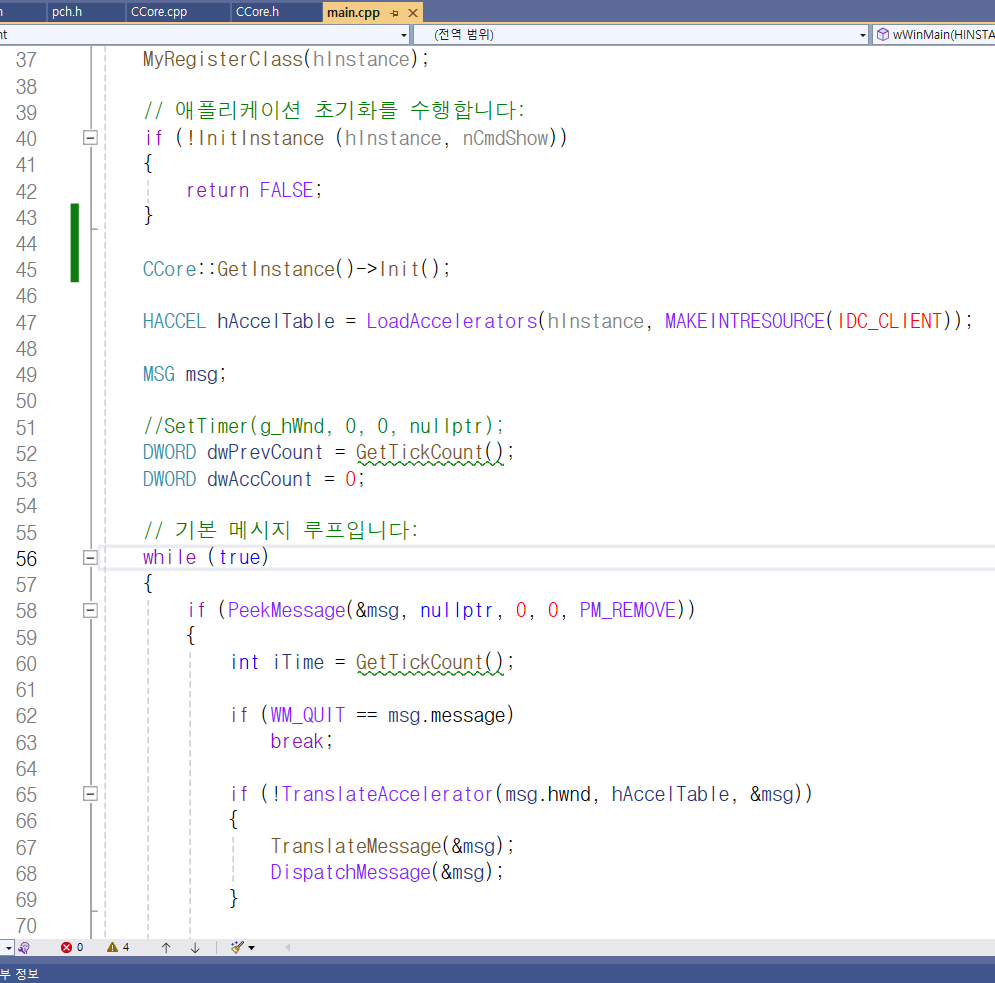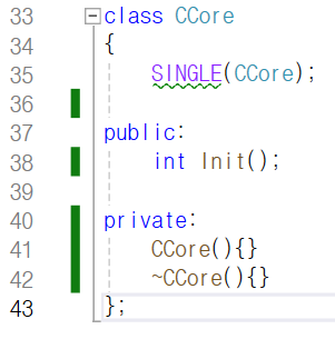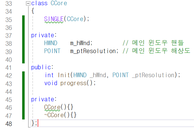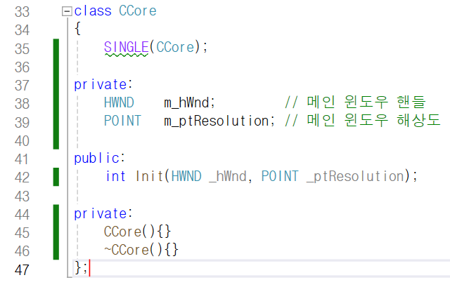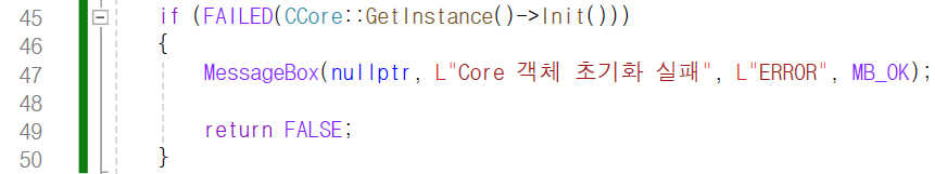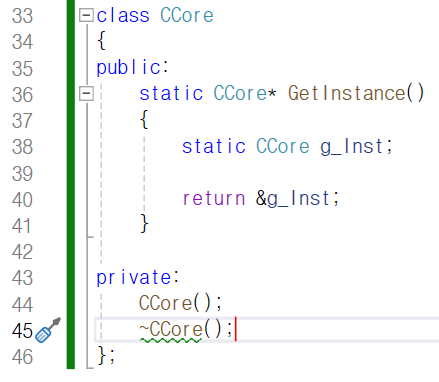 그 사이 45번째 줄에서 CCore형 싱글톤 객체를