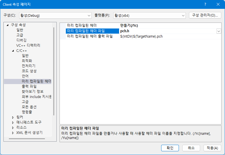 만들기로 바꾸고 미리 컴파일된 헤더 파일을 pch.h로 수정합니다.