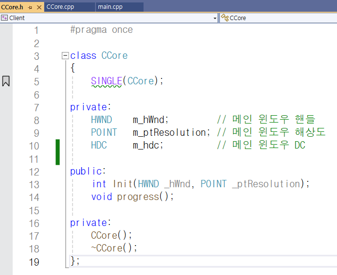 CCore 클래스로 만든 싱글톤 객체를 초기화하기 위한