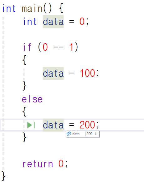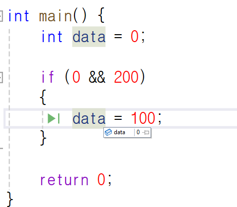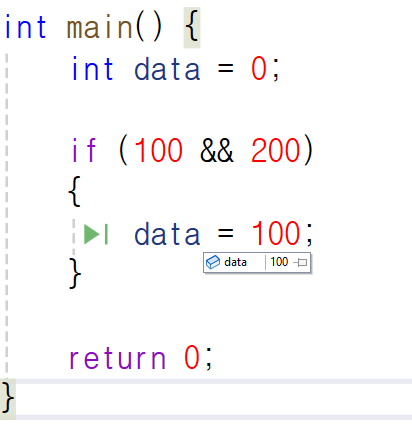 조건식의 결과가 참이므로 if문 중괄호 안, 변수 data에 100을 대입하라는 코드가 실행됩니다.