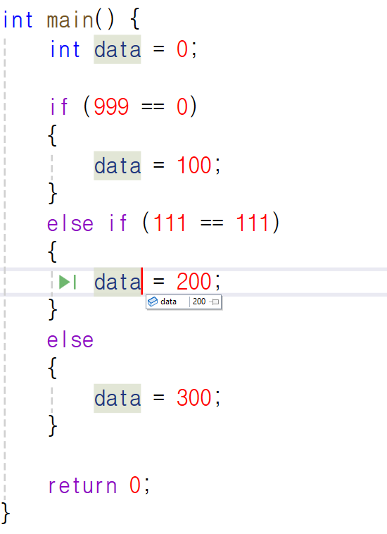 참이므로 else if문의 중괄호 안 코드를 실행하여 변수 data에 200이 대입되었습니다.