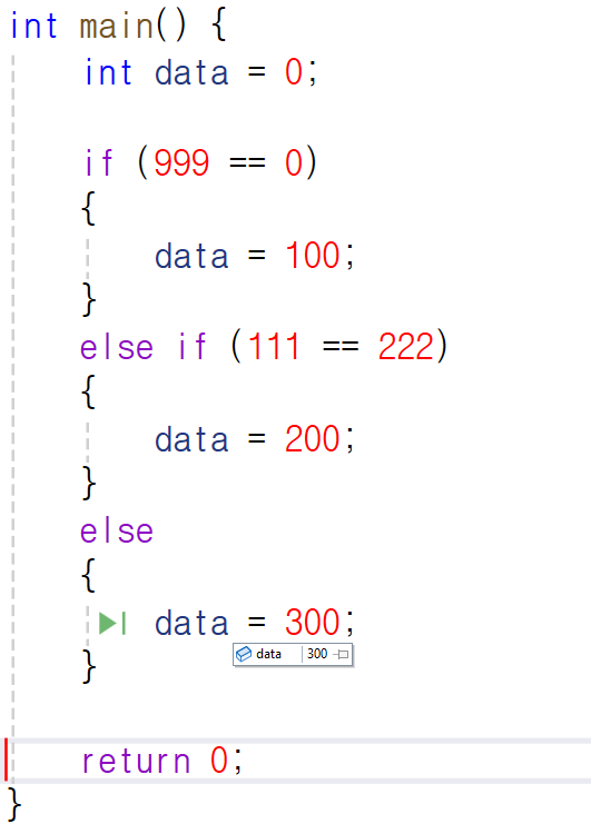 결국 else로 넘어가 변수 data에 300을 대입하라는 코드가 실행된 것을 확인할 수 있습니다.